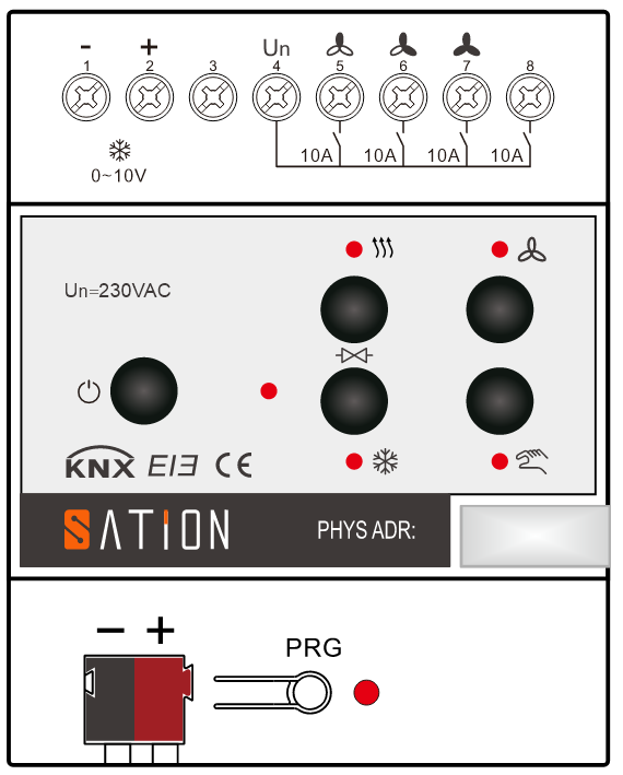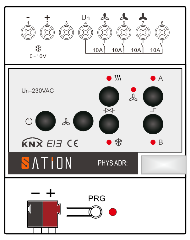 AC0503功能:对2管制的风机盘管进行控制,0~10V控制电磁阀,3路继电器切换风机风速高中低档,带手动控制,状态值查询回复。